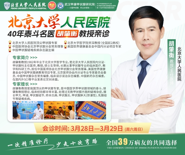作为国内甲状腺领域公认的泰斗级专家,胡肇衡教授的加盟无疑是本次会诊的核心亮点。胡教授1982年毕业于北京大学医学专业,现任北京大学人民医院内分泌·甲状腺科主任医师、教授及硕士生导师。他身兼中国医师协会北京甲状腺分会常务理事、美国世界健康基金会中国甲状腺病教育项目专家等数项重要学术职务,并在《中国甲状腺杂志》《临床误诊误治杂志》等核心期刊担任编委。胡教授长期致力于甲状腺疾病的临床、教学与科研工作,在国内外SCI等平台发表论文90余篇,尤其擅长甲亢、甲减、甲状腺结节、桥本氏病等疑难杂症的诊治,其理论功底与临床经验堪称业界典范。
